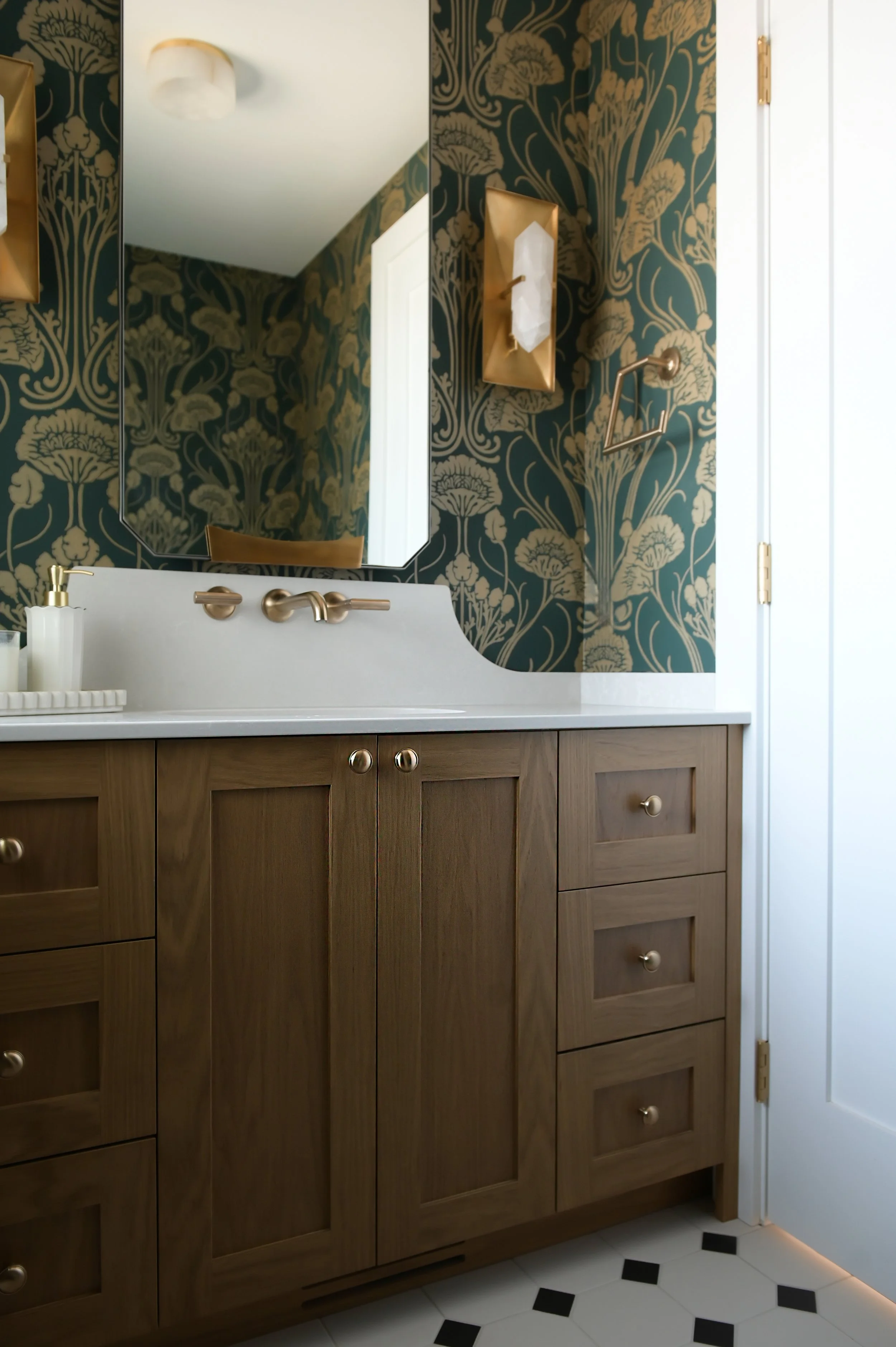 The powder room embraces a bold, hospitality-inspired design. Deep emerald and gold wallpaper sets a dramatic tone, contrasted by the natural warmth of white oak cabinetry. Crystal-inspired sconces and brushed brass hardware complete the look, turning this small space into a memorable design moment that’s both functional and luxurious..