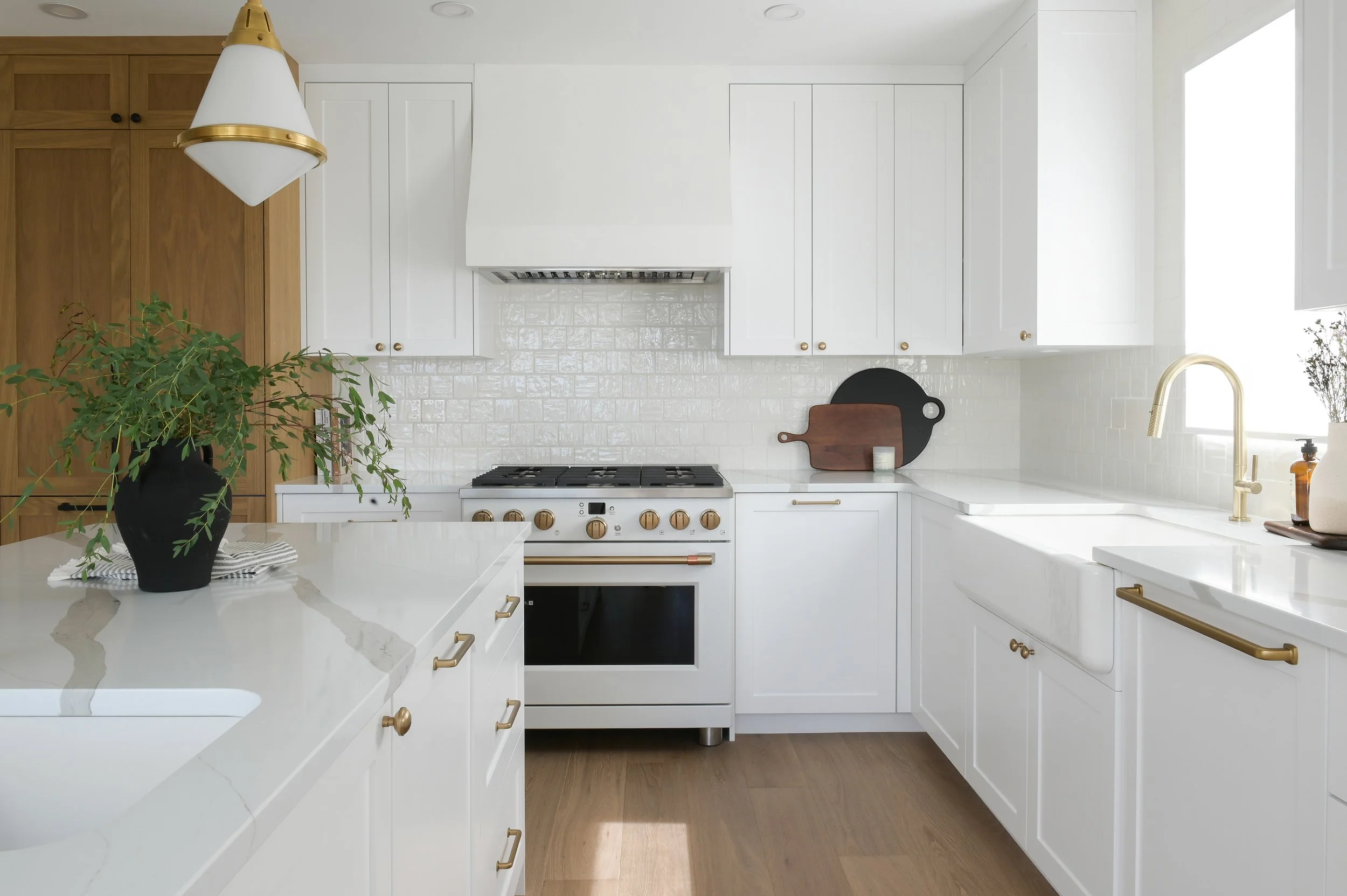 The kitchen renovation focuses on a crisp, white-on-wood palette, accented by brass hardware and gold-detailed pendant lighting. Custom shaker cabinetry, a professional-grade range, and Calacatta-style quartz countertops deliver a high-performance yet beautifully understated workspace. Velvet green counter stools add a bold, contemporary touch, while warm white oak flooring grounds the space.
